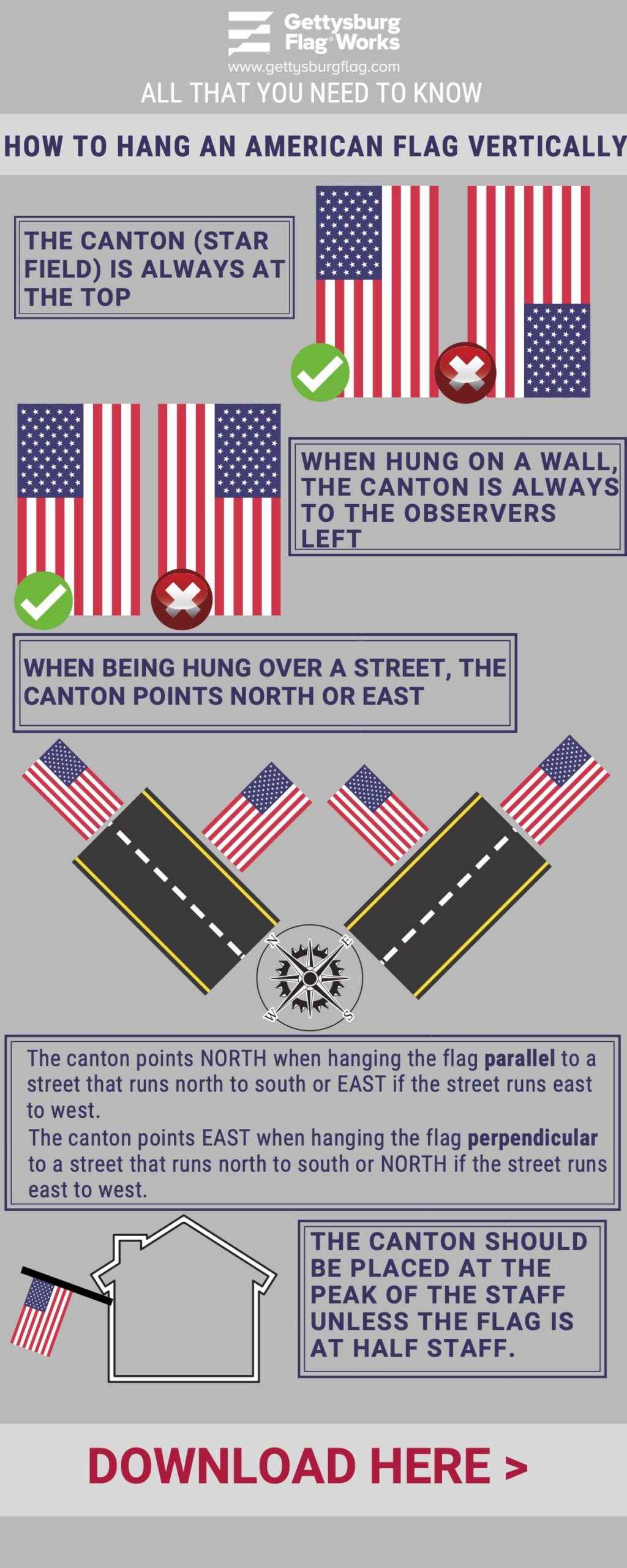 • If hanging on a flat surface, the flag should be displayed vertically with the union to the observer’s left.